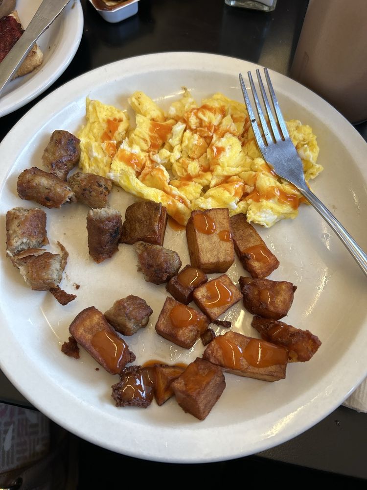 2 eggs, potato, cheddar cheese, onion, ham, tomato, all topped with sausage gravy.