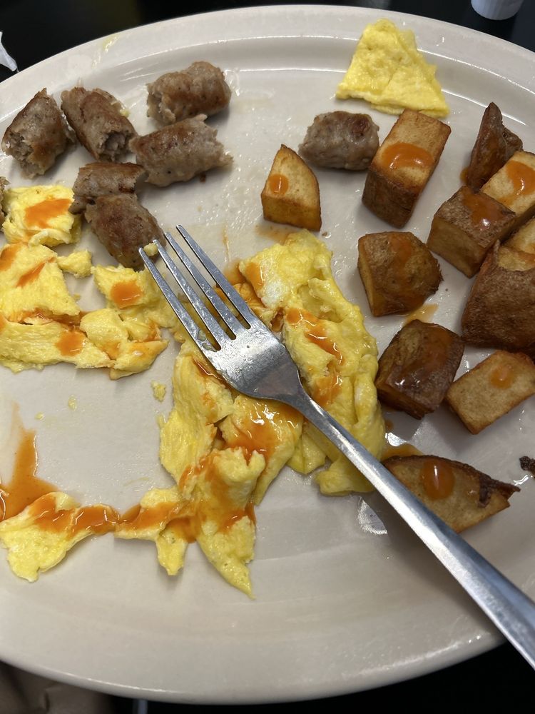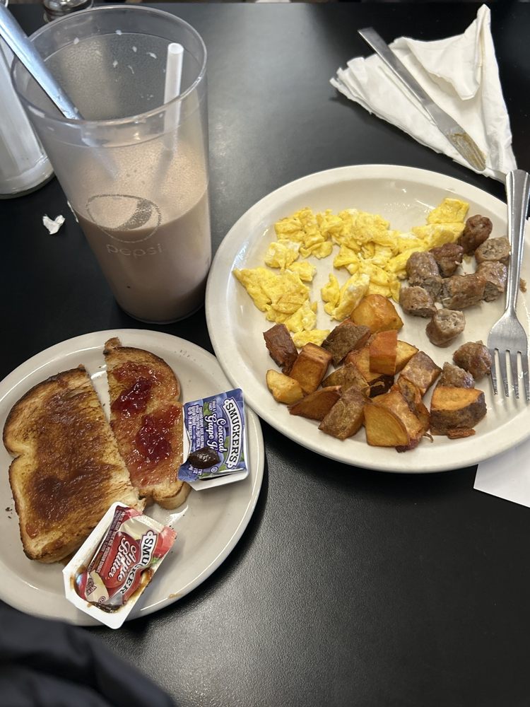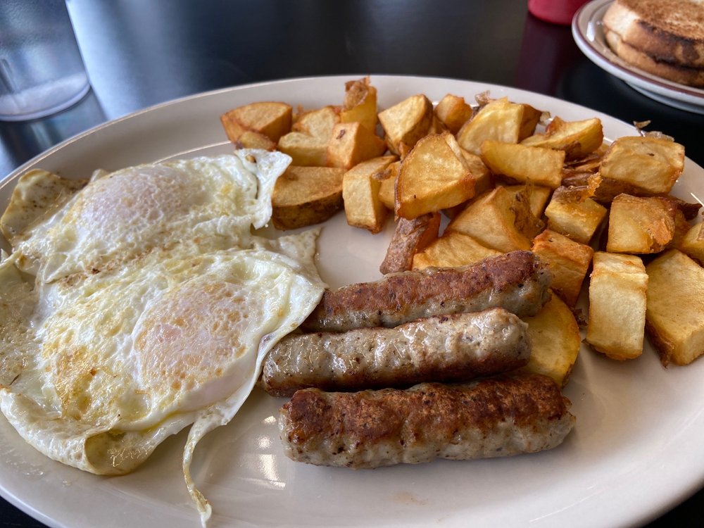 #1. Two Eggs with a choice of meat, and a choice of potatoes or grits, and a choice of toast
